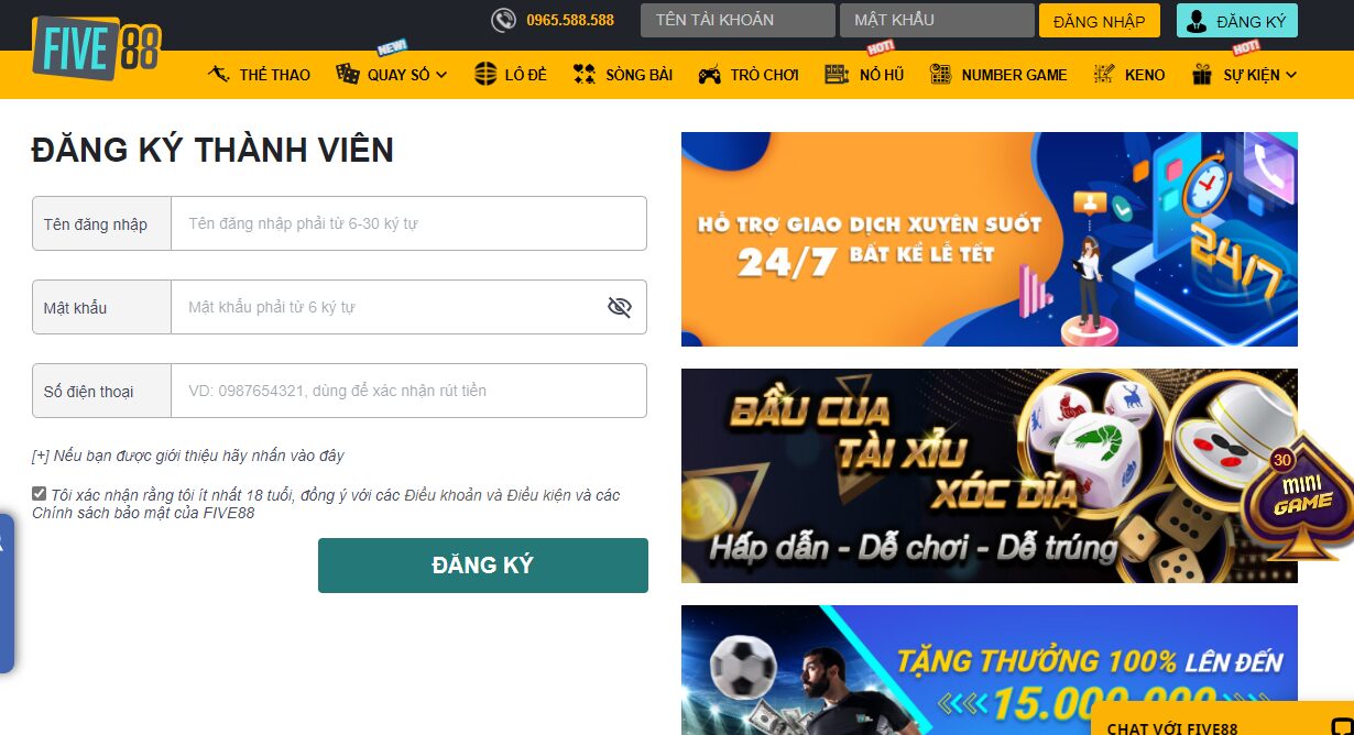 Để đăng ký tài khoản tại Five88, đầu tiên anh em nhấn vào mục đăng ký từ phía trang chủ. Kế đó nhập đầy đủ các thông tin và nhà cái yêu cầu như tên tài khoản, mật khẩu, họ tên, email, số điện thoại. Nhớ là kiểm tra kỹ các thông tin trước khi nhấn xác nhận đăng ký tài khoản.