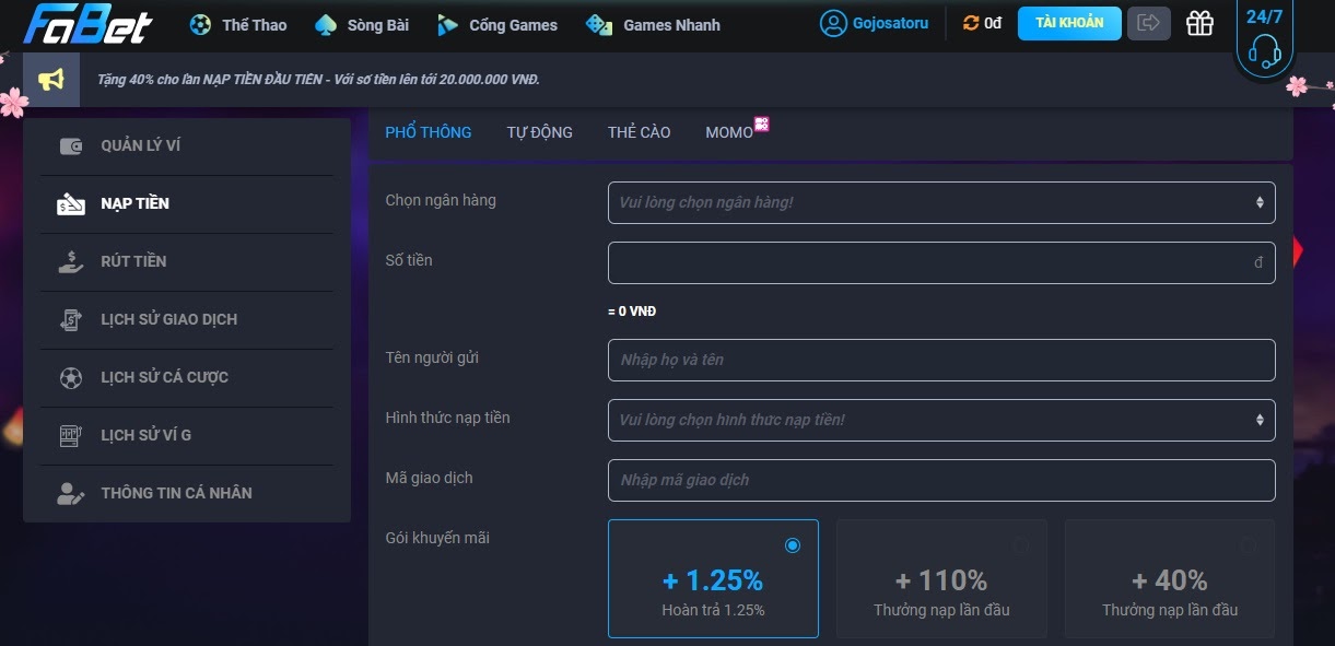 Anh em cần chọn đúng phương pháp nạp và ngân hàng giao dịch, đồng thời tiến hành điền đủ thông tin cần thiết để nạp tiền.