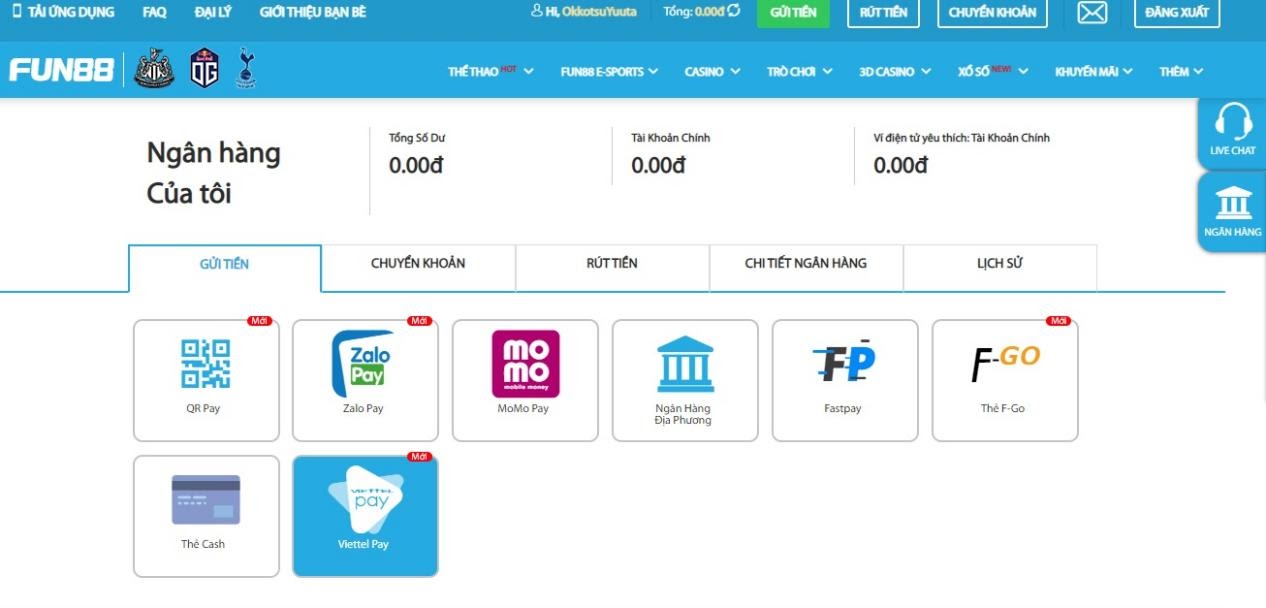 Nhà cái Fun88 với hệ thống giao dịch hiện đại bậc nhất hỗ trợ anh em các phương thức nạp tiền bao gồm: QR Pay, Zalo Pay, Momo Pay, Ngân hàng địa phương, FastPay, Thẻ F-Go, Thẻ Cash, Viettel Pay.