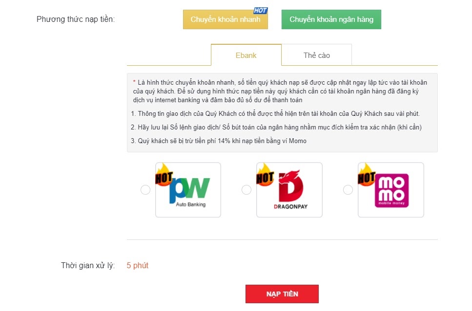 Với hình thức chuyển khoản nhanh, anh em có thể thực hiện nạp qua hai cách đó là nạp qua Ebank và nạp qua thẻ cào.