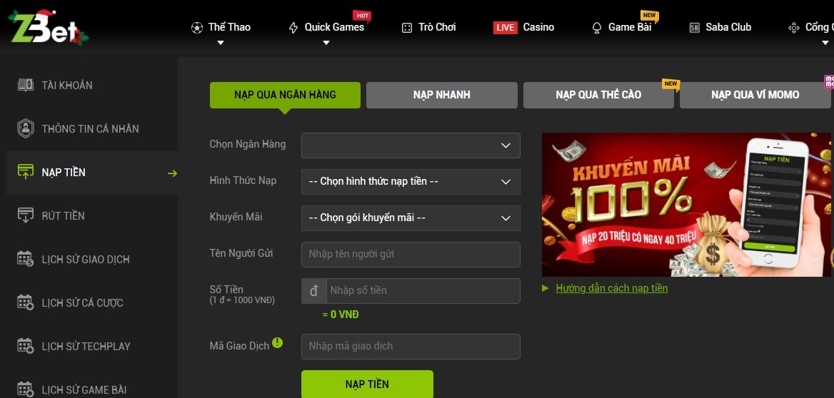 Nạp tiền qua ngân hàng tại nhà cái Zbet